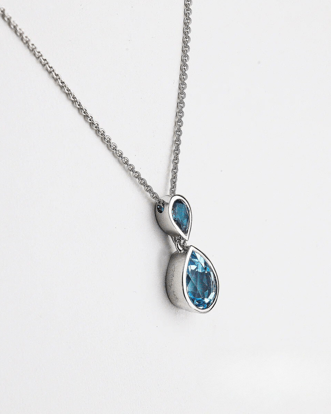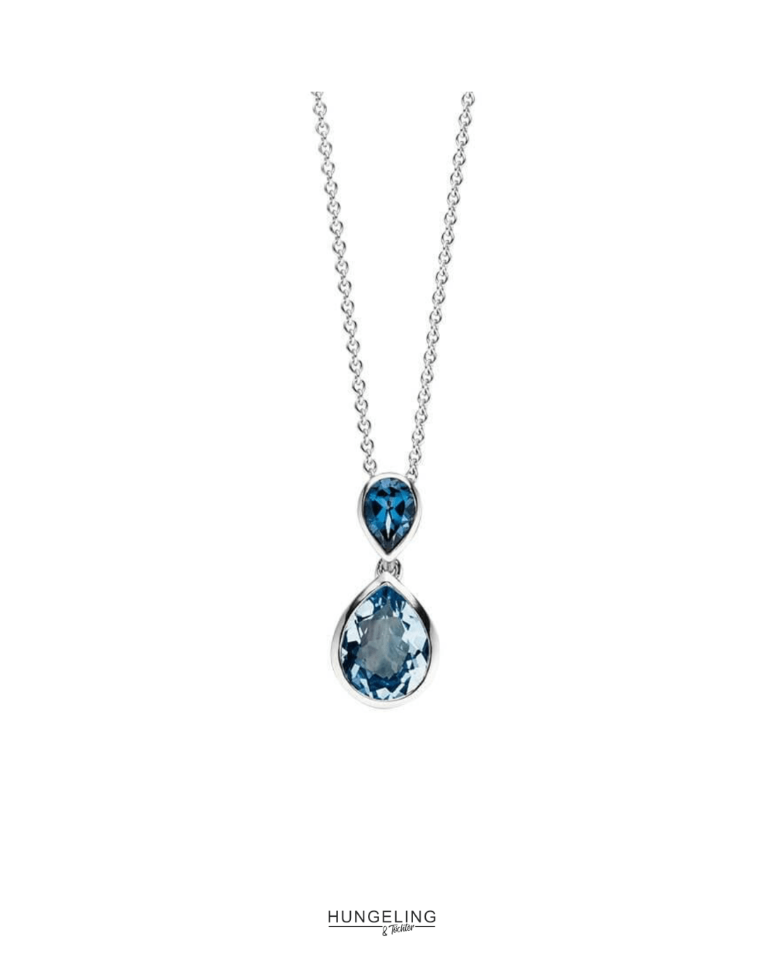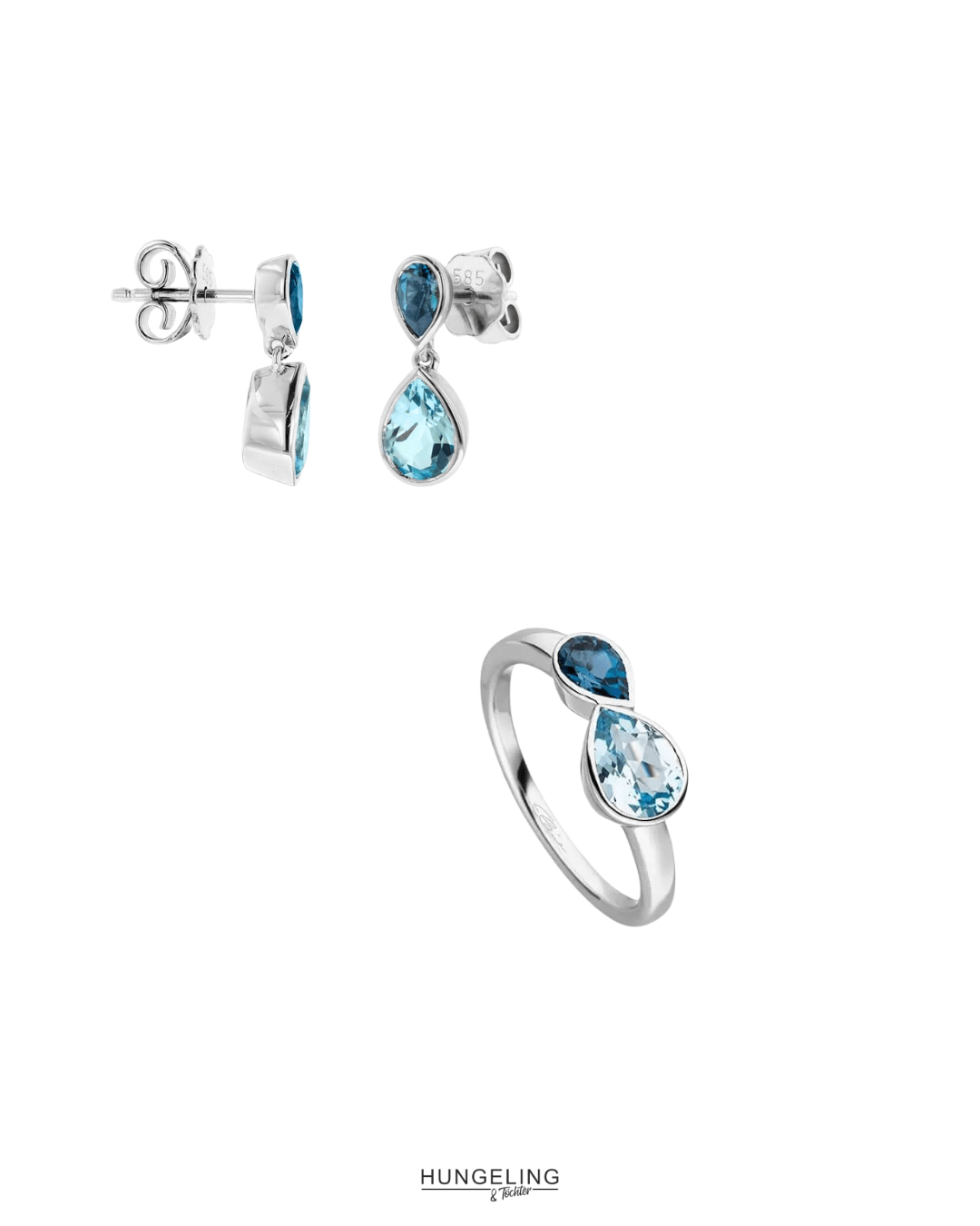 Die Kette mit Tropfenelementen aus London Blautopas und Sky Blautopas von @elaine_firenze in poliertem Weißgold verbindet Form und Farbe. Tiefes und helles Blau setzen elegante Akzente. Dazu passen Ohrstecker und Ring im gleichen Design.